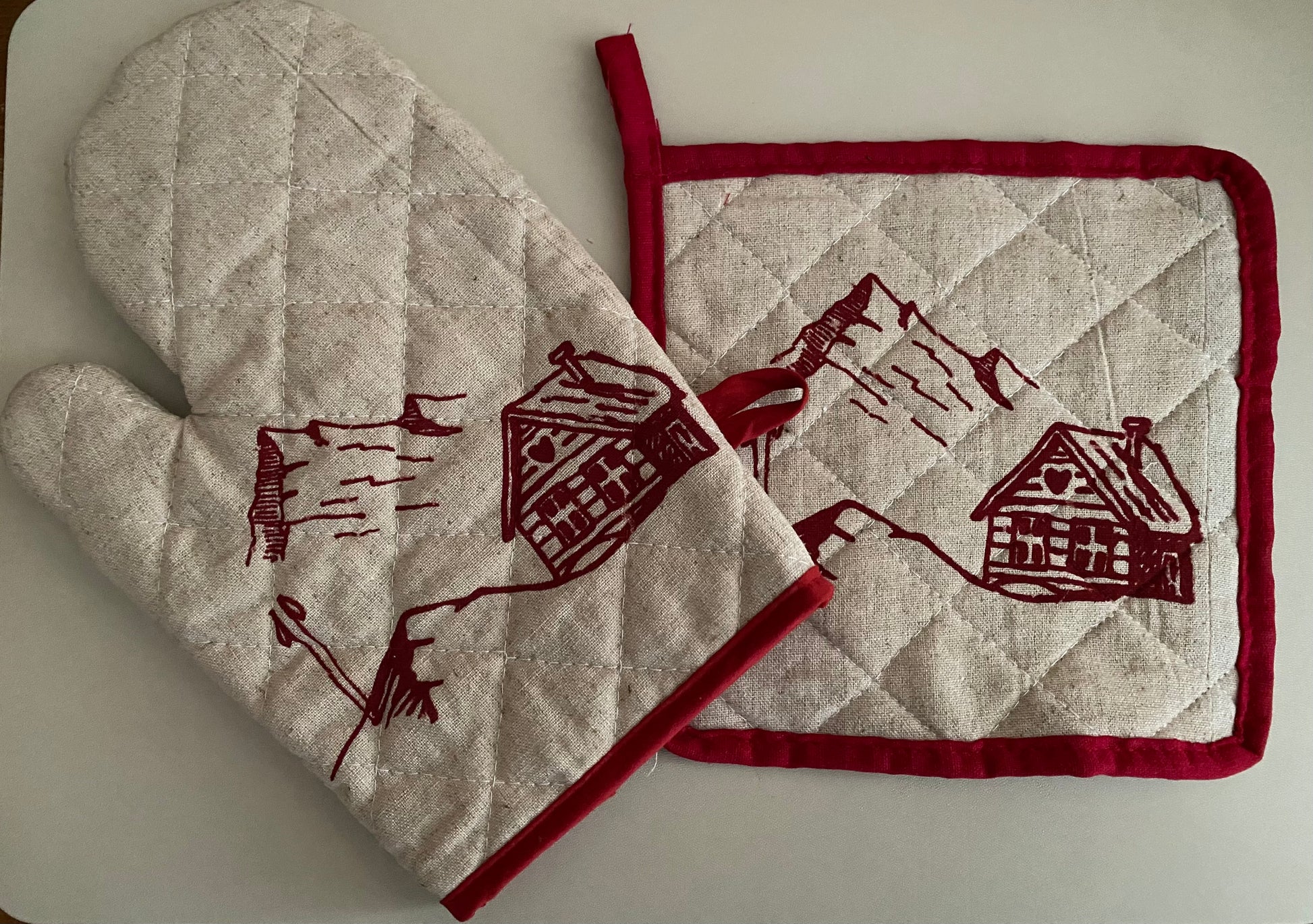 Gant et manique de cuisine beige et rouge avec motif montagne et chalet.