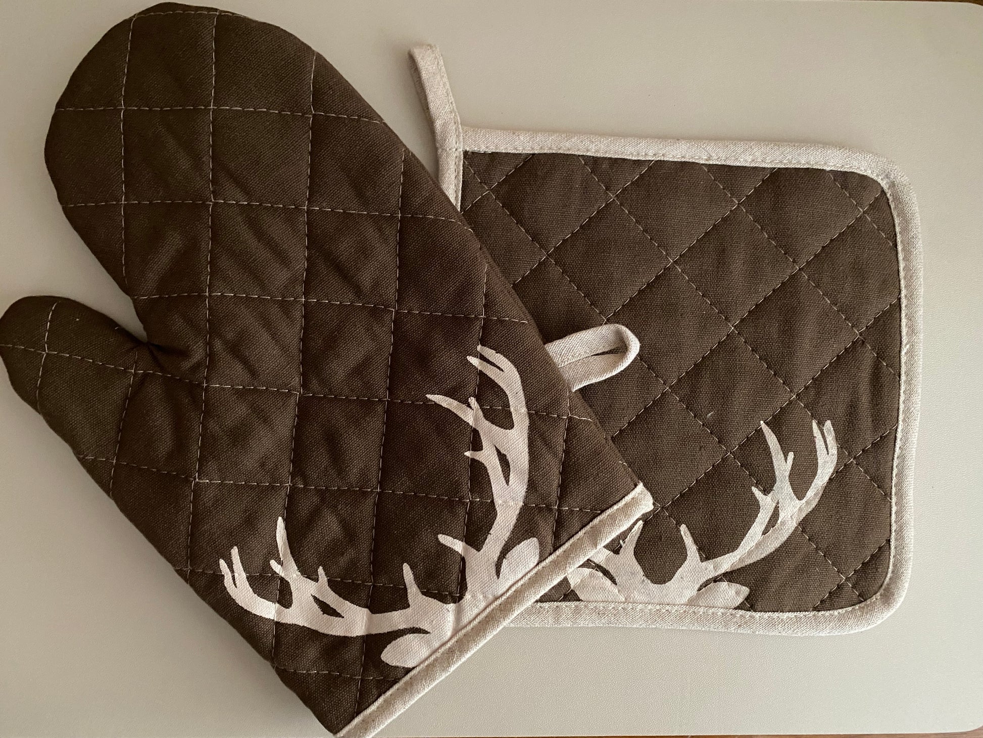 Gant et manique de cuisine brun avec motifs bois de cerf.